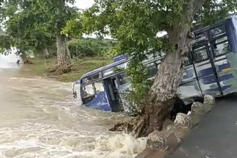 दमोह में उफनते नाले से पार कराने की कोशिश में बस अनियंत्रित होकर पुलिया से नीचे लटकी