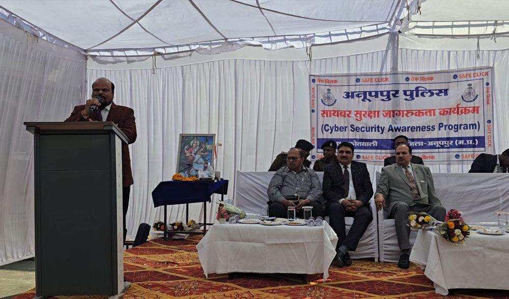 पुलिस मुख्यालय, भोपाल के निर्देश पर पुलिस अधीक्षक अनूपपुर श्री मोती उर रहमान जी के द्वारा सायबर क्राईम सुरक्षा जागरूकता हेतु चलाये जा रहे सेफ क्लिक अभियान के अंतर्गत शुक्रवार की सुबह माननीय प्रधान जिला एवं सत्र न्यायाधीश महोदय अनूपपुर श्रीमान पी.सी. गुप्ता, माननीय प्रधान न्यायाधीश कुटुम्ब न्यायालय अनूपपुर श्री मनोज कुमार लाढिया, माननीय द्वितीय जिला एवं अपर सत्र न्यायाधीश अनूपपुर श्री नरेन्द्र पटेल, माननीय मुख्य न्यायिक मजिस्ट्रेट अनूपपुर श्रीमती चेनवती ताराम, माननीय न्यायिक मजिस्ट्रेट प्रथम श्रेणी अनूपपुर श्रीमती पारूल जैन, माननीय न्यायिक मजिस्ट्रेट अनूपपुर सुश्री सृष्टि साहू, जिला विधिक सहायता अधिकारी श्री दिलावर सिहं, प्राचार्य तुलसी महाविद्यालय श्री अनिल सक्सेना, श्रीमान अतिरिक्त पुलिस अधीक्षक महोदय श्री इसरार मन्सूरी, श्रीमान एस.डी.ओ.पी. महोदय अनूपपुर श्री सुमित केरकेट्टा की गरिमामय उपस्थिति में प्रधानमंत्री कालेज आफ एक्सीलेन्स तुलसी महाविद्यालय अनूपपुर में कोतवाली पुलिस अनूपपुर द्वारा करीब 300 छात्र – छात्राओं के बीच सायबर क्राईम सुरक्षा जागरूकता कार्यक्रम का आयोजन किया गया।