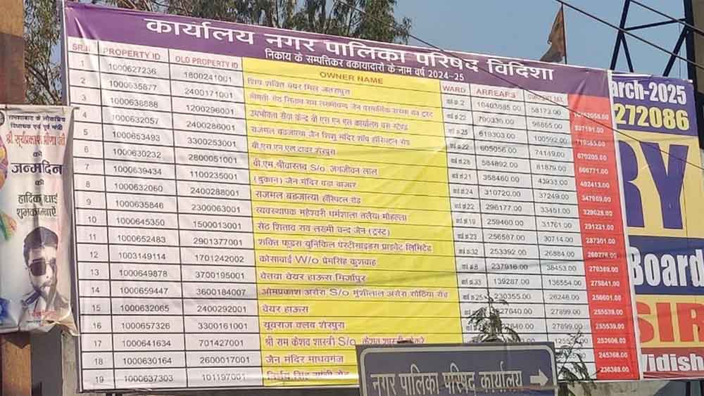 विदिशा नगरपालिका ने अपने बकायादारों की सूची अब सार्वजनिक करना शुरू कर दिया है। सबसे पहले शहर के टॉप 20